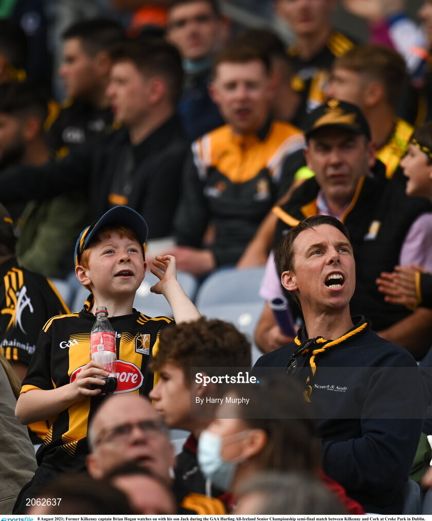8 August 2021; Former Kilkenny captain Brian Hogan watches on with his son Jack during the GAA Hurling All-Ireland Senior Championship semi-final match between Kilkenny and Cork at Croke Park in Dublin. Photo by Harry Murphy/Sportsfile