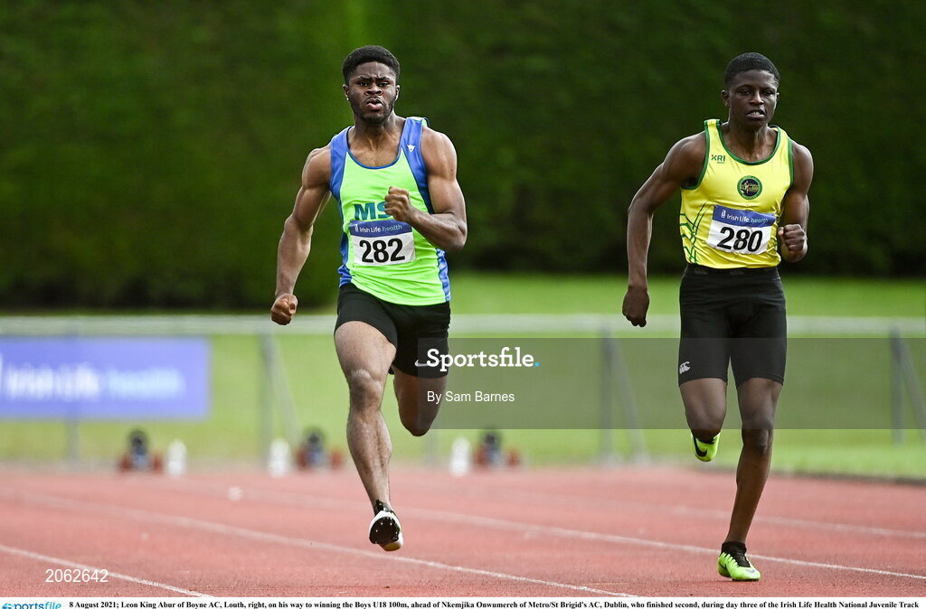 8 August 2021; Leon King Abur of Boyne AC, Louth, right, on his way to winning the Boys U18 100m, ahead of Nkemjika Onwumereh of Metro/St Brigid's AC, Dublin, who finished second, during day three of the Irish Life Health National Juvenile Track & Field Championships at Tullamore Harriers Stadium in Tullamore, Offaly. Photo by Sam Barnes/Sportsfile