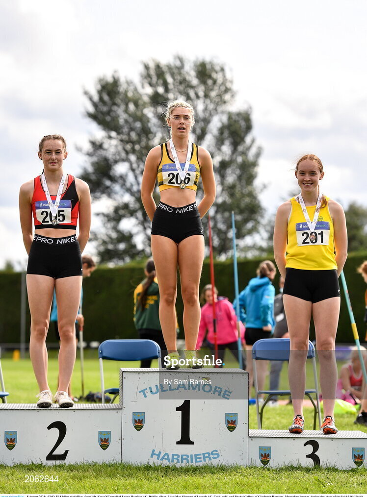 8 August 2021; Girl's U18 100m medallists, from left, Kate O'Connell of Lucan Harriers AC, Dublin, silver, Lucy-May Sleeman of Leevale AC, Cork, gold, and Rachel Callery of Glaslough Harriers, Monaghan, bronze, during day three of the Irish Life Health National Juvenile Track & Field Championships at Tullamore Harriers Stadium in Tullamore, Offaly. Photo by Sam Barnes/Sportsfile