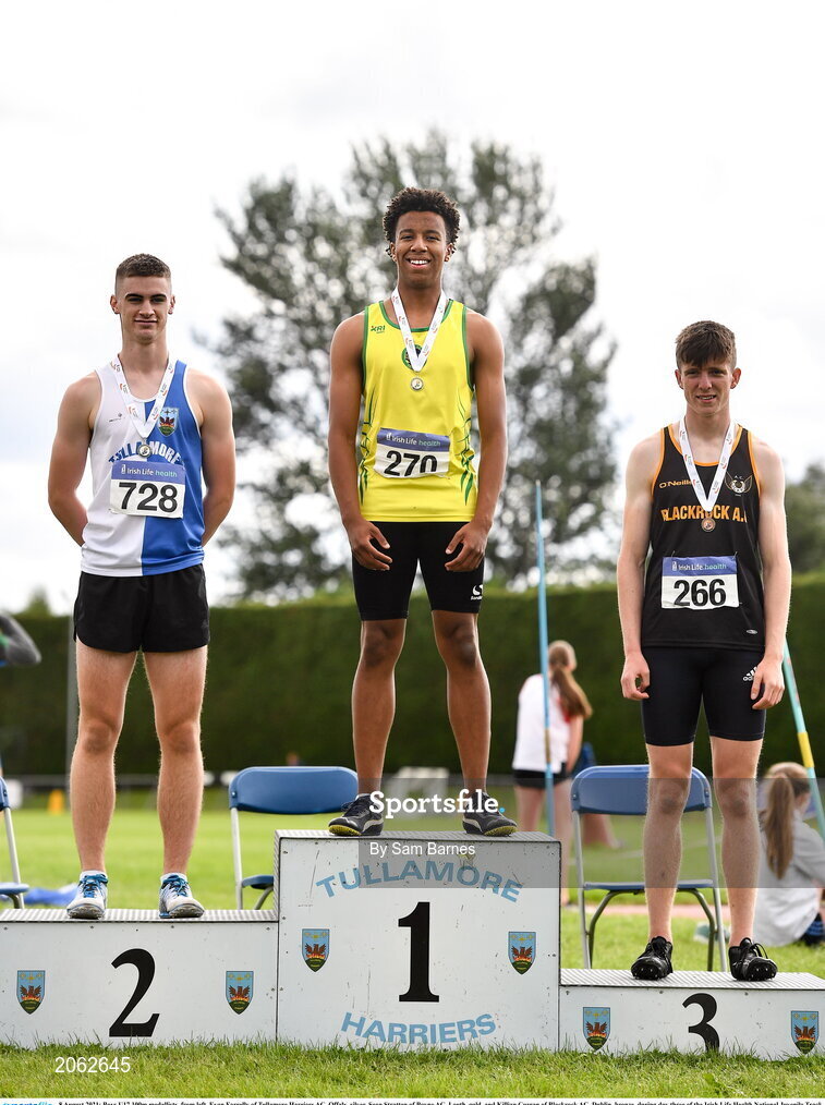 8 August 2021; Boys U17 100m medallists, from left, Evan Farrelly of Tullamore Harriers AC, Offaly, silver, Sean Stratton of Boyne AC, Louth, gold, and Killian Curran of Blackrock AC, Dublin, bronze, during day three of the Irish Life Health National Juvenile Track & Field Championships at Tullamore Harriers Stadium in Tullamore, Offaly. Photo by Sam Barnes/Sportsfile