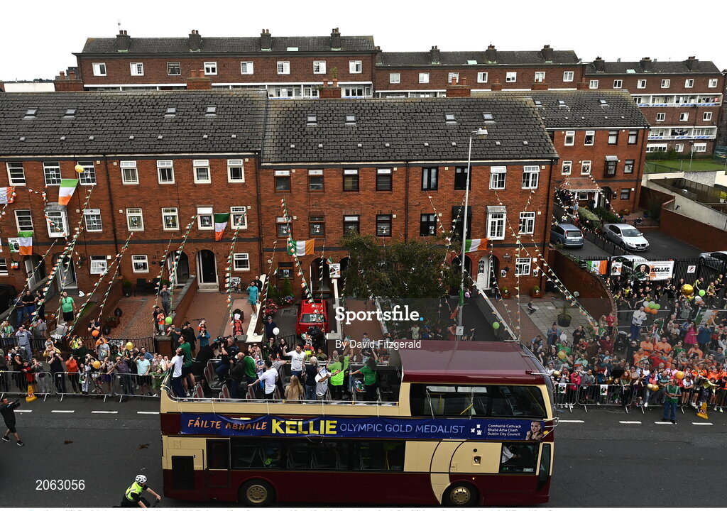 10 August 2021; Team Ireland women's lightweight gold medallist Kellie Harrington and Emmet Brennan pass through Portland Row in Dublin on their return from the Tokyo 2020 Summer Olympic Games. Photo by David Fitzgerald/Sportsfile