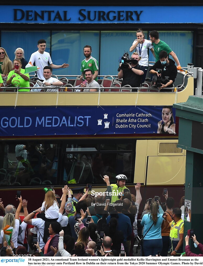 10 August 2021; An emotional Team Ireland women's lightweight gold medallist Kellie Harrington and Emmet Brennan as the bus turns the corner onto Portland Row in Dublin on their return from the Tokyo 2020 Summer Olympic Games. Photo by David Fitzgerald/Sportsfile