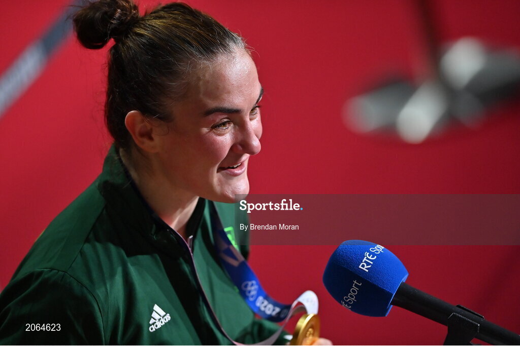 8 August 2021; Kellie Harrington of Ireland is interviewed after defeating Beatriz Ferreira of Brazil in their women's lightweight final bout with at the Kokugikan Arena during the 2020 Tokyo Summer Olympic Games in Tokyo, Japan. Photo by Brendan Moran/Sportsfile Photo by Brendan Moran/Sportsfile