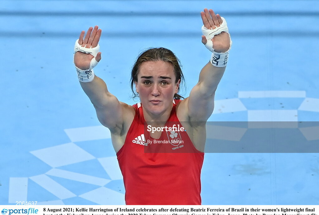 8 August 2021; Kellie Harrington of Ireland celebrates after defeating Beatriz Ferreira of Brazil in their women's lightweight final bout at the Kokugikan Arena during the 2020 Tokyo Summer Olympic Games in Tokyo, Japan. Photo by Brendan Moran/Sportsfile