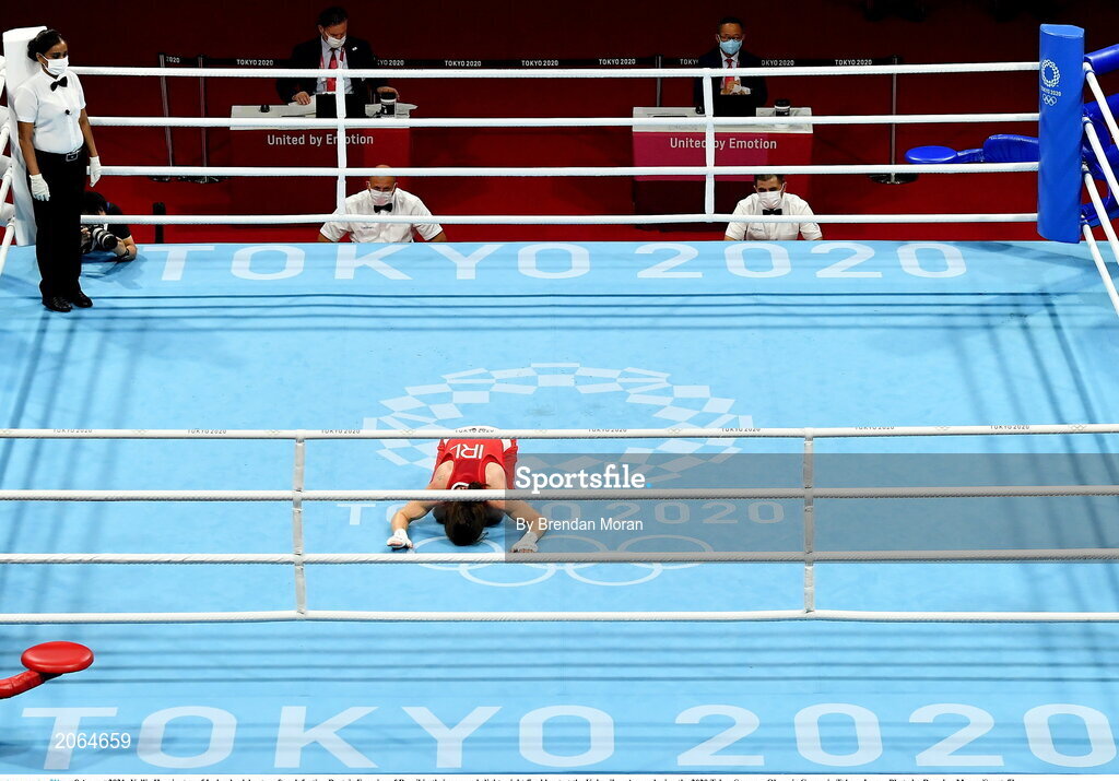 8 August 2021; Kellie Harrington of Ireland celebrates after defeating Beatriz Ferreira of Brazil in their women's lightweight final bout at the Kokugikan Arena during the 2020 Tokyo Summer Olympic Games in Tokyo, Japan. Photo by Brendan Moran/Sportsfile