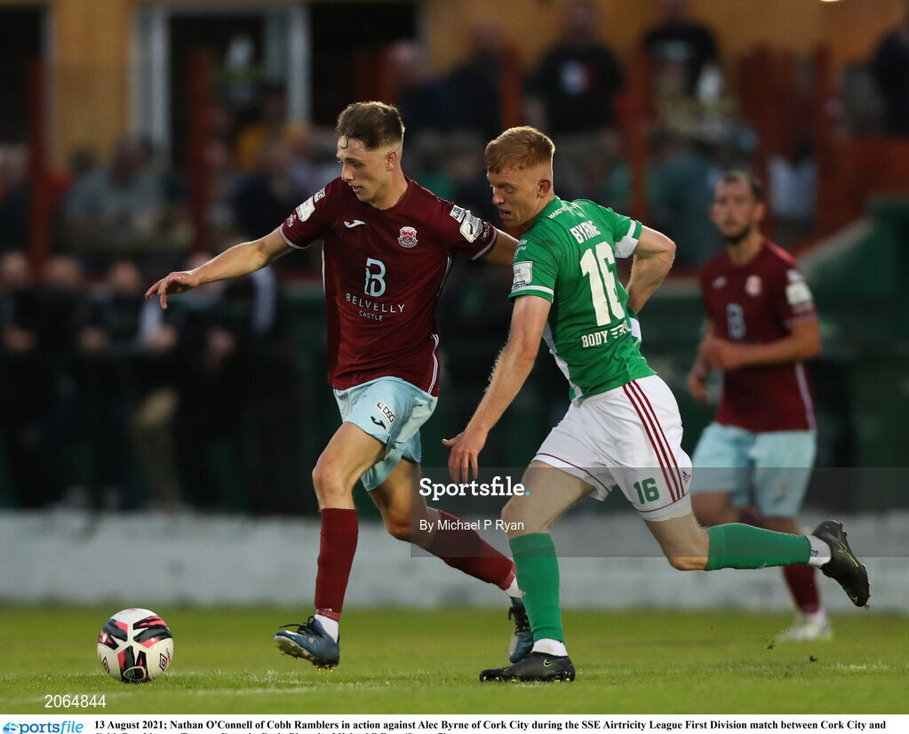 13 August 2021; Nathan O'Connell of Cobh Ramblers in action against Alec Byrne of Cork City during the SSE Airtricity League First Division match between Cork City and Cobh Ramblers at Turners Cross in Cork. Photo by Michael P Ryan/Sportsfile