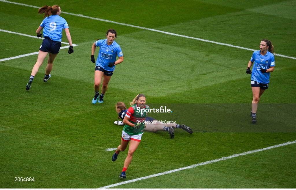 14 August 2021; Sarah Rowe of Mayo after scoring her side's first goal during the TG4 Ladies Football All-Ireland Championship semi-final match between Dublin and Mayo at Croke Park in Dublin. Photo by Stephen McCarthy/Sportsfile
