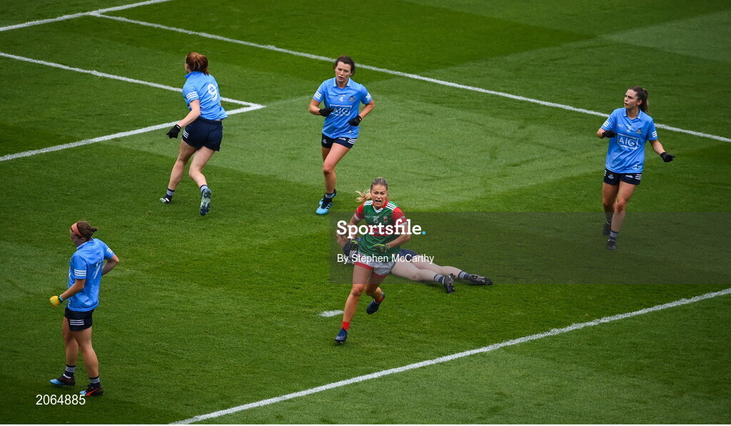 14 August 2021; Sarah Rowe of Mayo after scoring her side's first goal during the TG4 Ladies Football All-Ireland Championship semi-final match between Dublin and Mayo at Croke Park in Dublin. Photo by Stephen McCarthy/Sportsfile