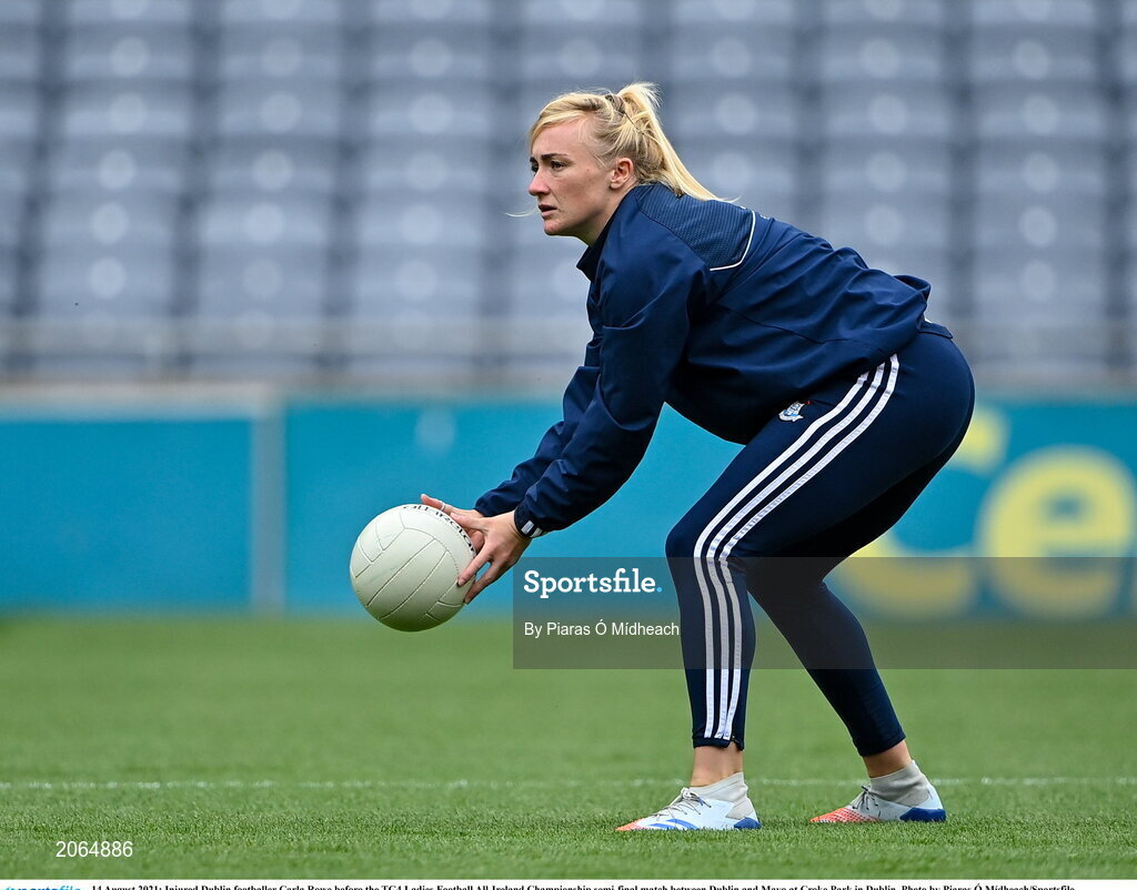 14 August 2021; Injured Dublin footballer Carla Rowe before the TG4 Ladies Football All-Ireland Championship semi-final match between Dublin and Mayo at Croke Park in Dublin. Photo by Piaras Ó Mídheach/Sportsfile
