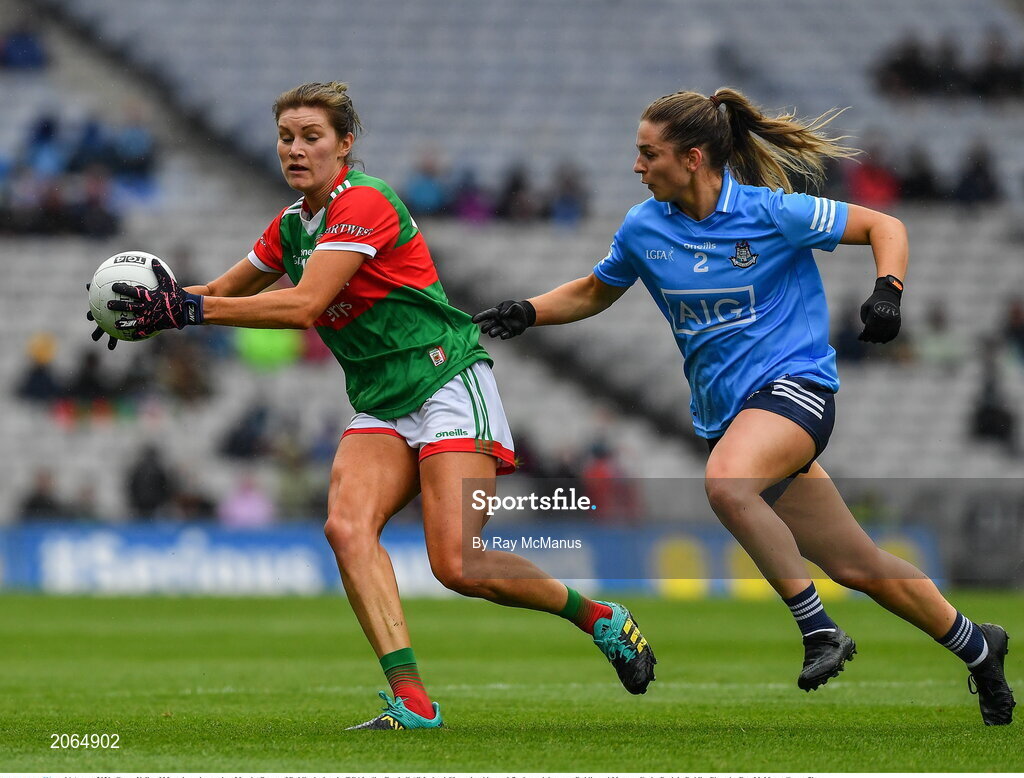 14 August 2021; Grace Kelly of Mayo in action against Martha Byrne of Dublin during the TG4 Ladies Football All-Ireland Championship semi-final match between Dublin and Mayo at Croke Park in Dublin. Photo by Ray McManus/Sportsfile