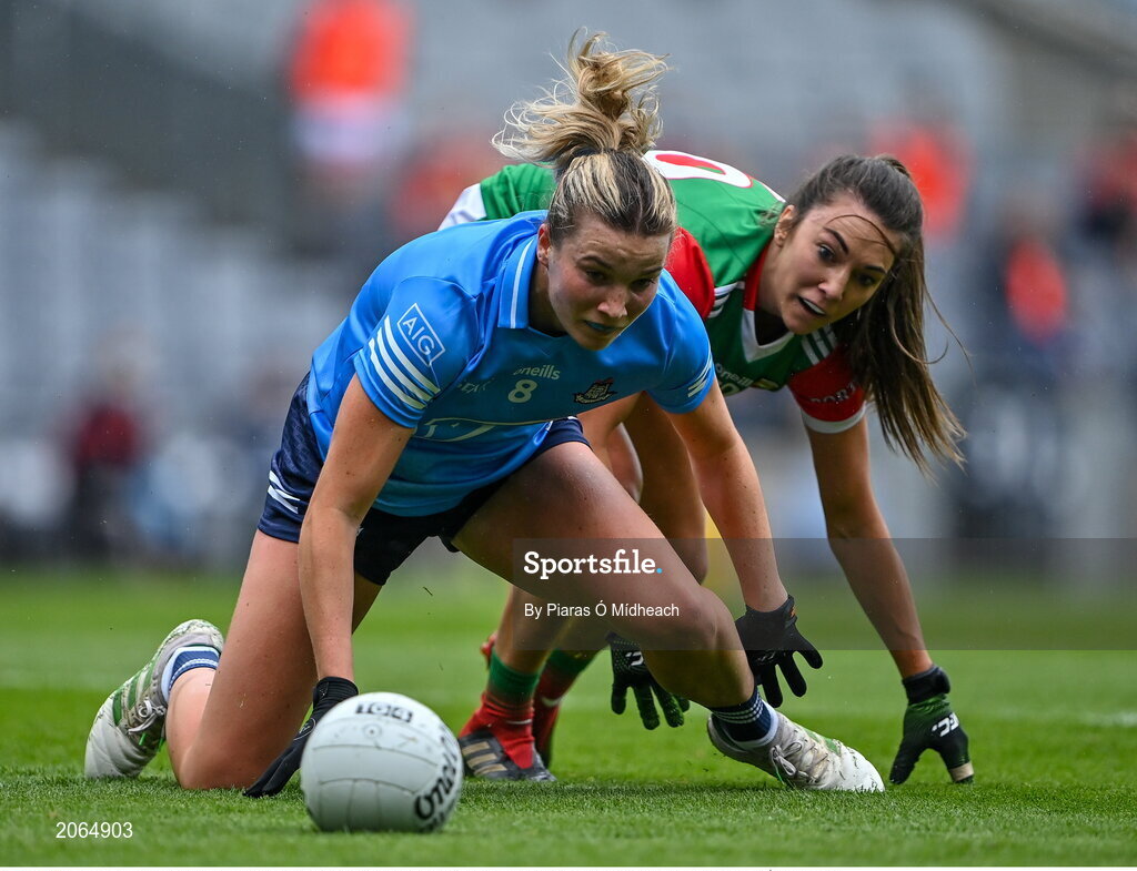 14 August 2021; Jennifer Dunne of Dublin in action against Niamh Kelly of Mayo during the TG4 Ladies Football All-Ireland Championship semi-final match between Dublin and Mayo at Croke Park in Dublin. Photo by Piaras Ó Mídheach/Sportsfile