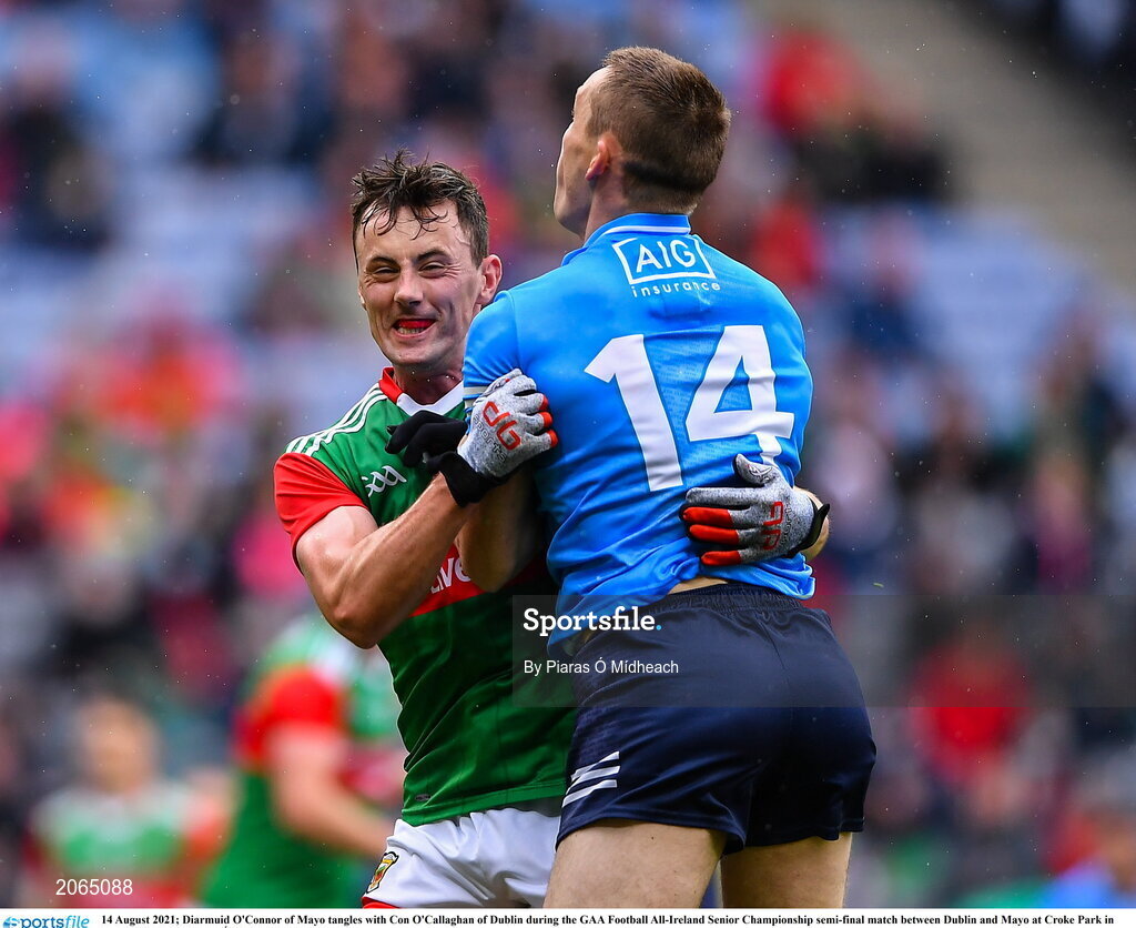 14 August 2021; Diarmuid O'Connor of Mayo tangles with Con O'Callaghan of Dublin during the GAA Football All-Ireland Senior Championship semi-final match between Dublin and Mayo at Croke Park in Dublin. Photo by Piaras Ó Mídheach/Sportsfile