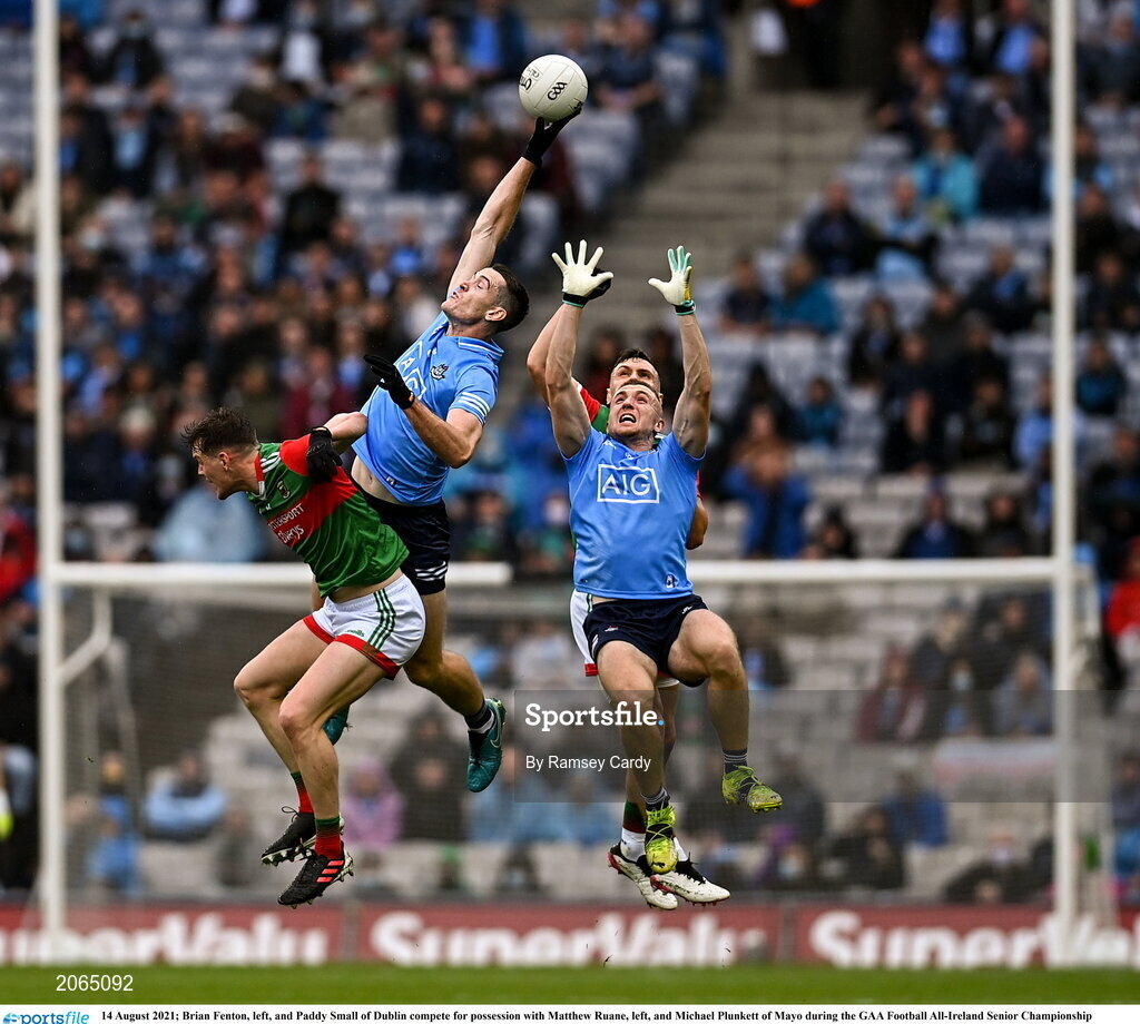 14 August 2021; Brian Fenton, left, and Paddy Small of Dublin compete for possession with Matthew Ruane, left, and Michael Plunkett of Mayo during the GAA Football All-Ireland Senior Championship semi-final match between Dublin and Mayo at Croke Park in Dublin. Photo by Ramsey Cardy/Sportsfile
