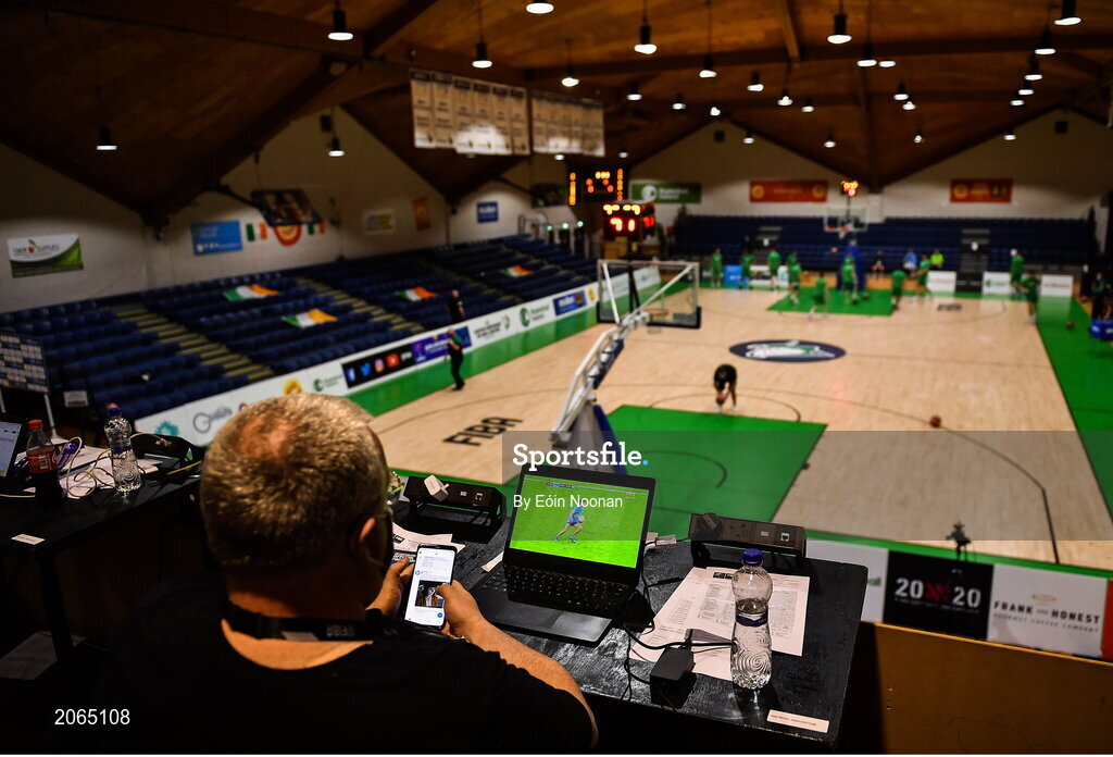 14 August 2021; Journalist Emmet Ryan watches the All-Ireland Senior Championship semi-final match between Dublin and Mayo at Croke Park from the media tribune as the Ireland men's basketball team warm-up before their European Championship for Small Countries match against Gibraltar at the National Basketball Arena in Dublin. Photo by Eóin Noonan/Sportsfile