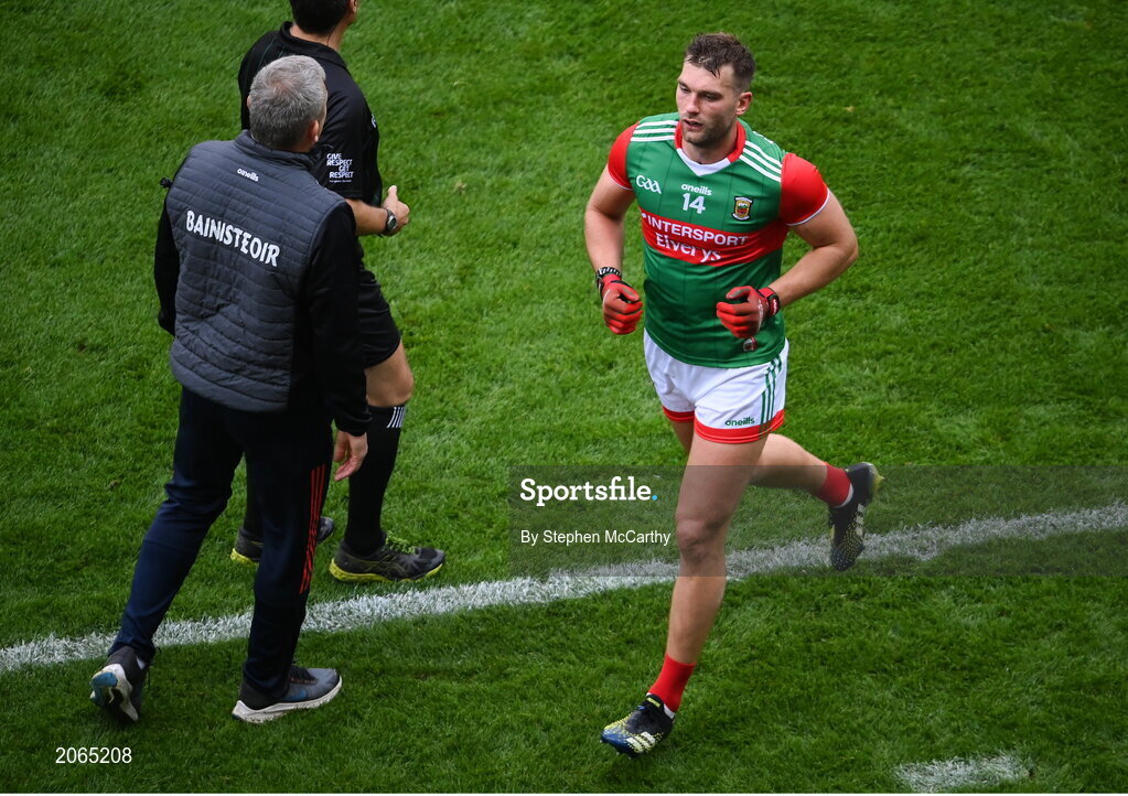 14 August 2021; Aidan O'Shea of Mayo passes Mayo manager James Horan after he is substituted in the second half of the GAA Football All-Ireland Senior Championship semi-final match between Dublin and Mayo at Croke Park in Dublin. Photo by Stephen McCarthy/Sportsfile