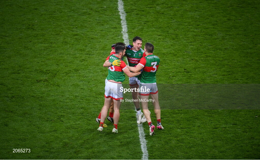14 August 2021; Mayo players, from left, Enda Hession, Brendan Harrison, Patrick Durcan and Lee Keegan, 3, celebrate following the GAA Football All-Ireland Senior Championship semi-final match between Dublin and Mayo at Croke Park in Dublin. Photo by Stephen McCarthy/Sportsfile