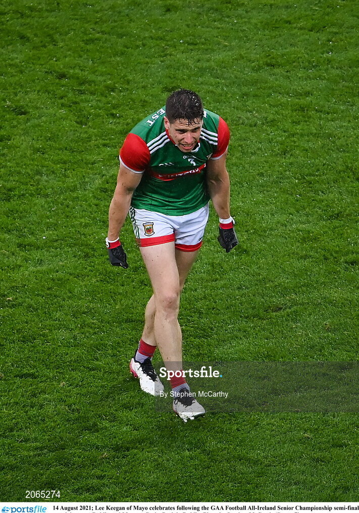 14 August 2021; Lee Keegan of Mayo celebrates following the GAA Football All-Ireland Senior Championship semi-final match between Dublin and Mayo at Croke Park in Dublin. Photo by Stephen McCarthy/Sportsfile