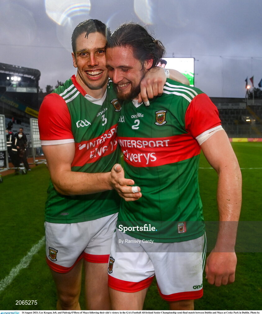 14 August 2021; Lee Keegan, left, and Pádraig O'Hora of Mayo following their side's victory in the GAA Football All-Ireland Senior Championship semi-final match between Dublin and Mayo at Croke Park in Dublin. Photo by Ramsey Cardy/Sportsfile