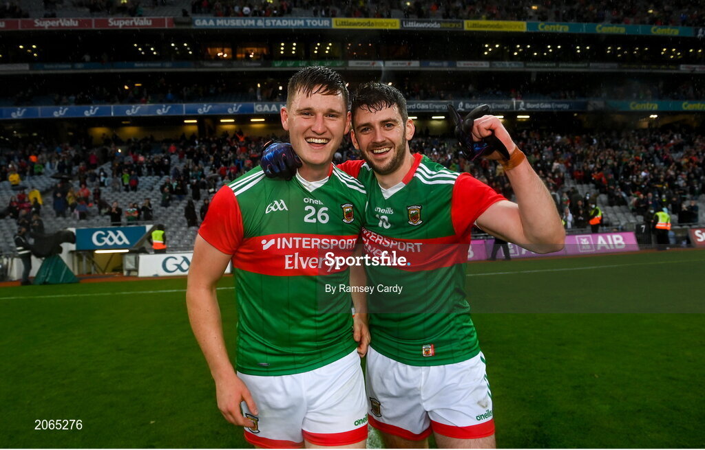 14 August 2021; James Carr, left, and Brendan Harrison of Mayo following their side's victory in the GAA Football All-Ireland Senior Championship semi-final match between Dublin and Mayo at Croke Park in Dublin. Photo by Ramsey Cardy/Sportsfile