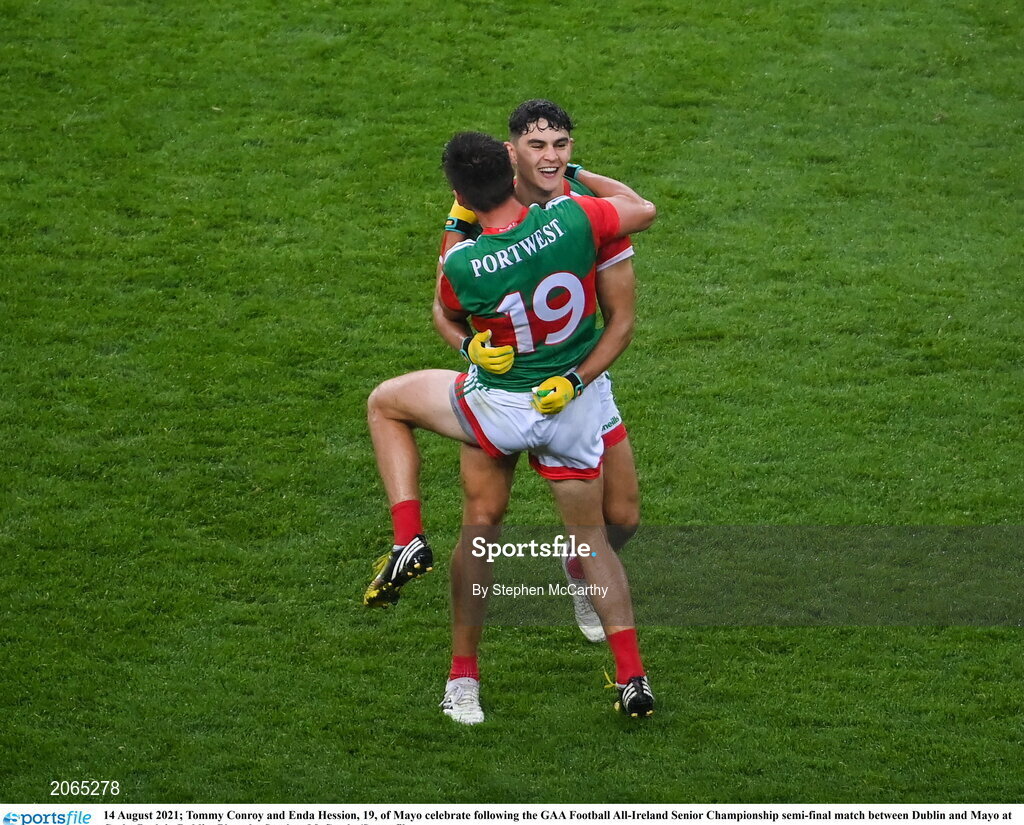 14 August 2021; Tommy Conroy and Enda Hession, 19, of Mayo celebrate following the GAA Football All-Ireland Senior Championship semi-final match between Dublin and Mayo at Croke Park in Dublin. Photo by Stephen McCarthy/Sportsfile
