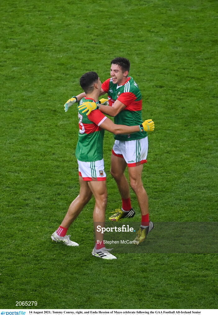 14 August 2021; Tommy Conroy, right, and Enda Hession of Mayo celebrate following the GAA Football All-Ireland Senior Championship semi-final match between Dublin and Mayo at Croke Park in Dublin. Photo by Stephen McCarthy/Sportsfile