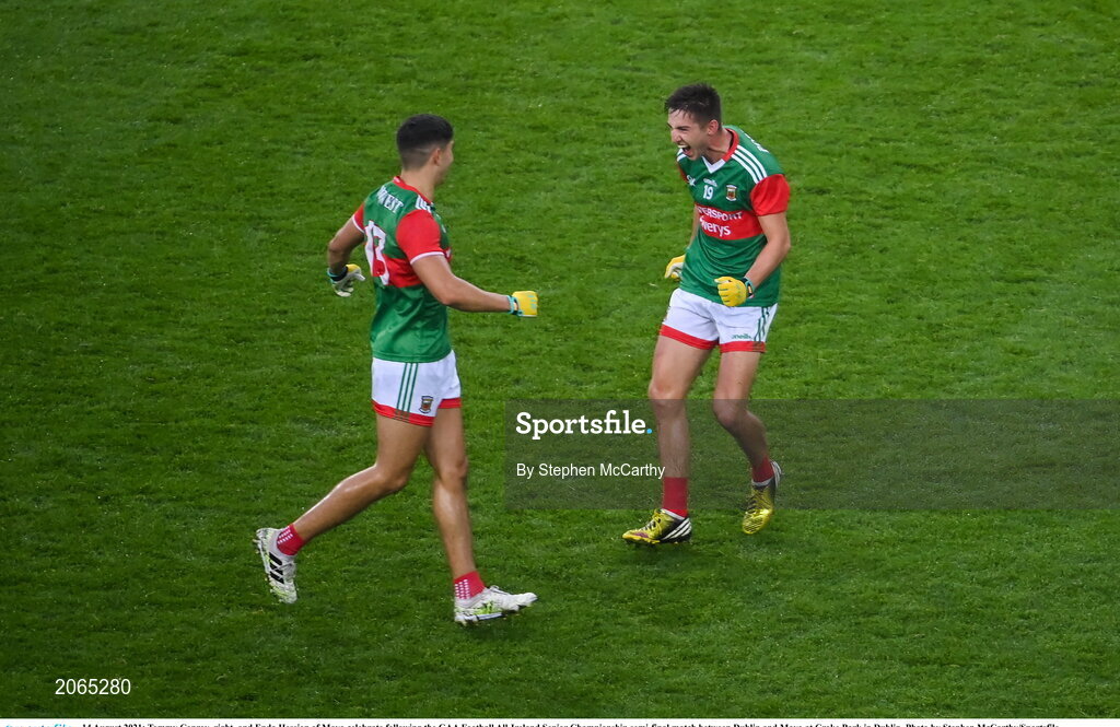 14 August 2021; Tommy Conroy, right, and Enda Hession of Mayo celebrate following the GAA Football All-Ireland Senior Championship semi-final match between Dublin and Mayo at Croke Park in Dublin. Photo by Stephen McCarthy/Sportsfile