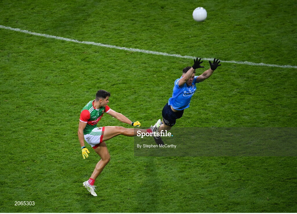 14 August 2021; Tommy Conroy of Mayo in action against David Byrne of Dublin during the GAA Football All-Ireland Senior Championship semi-final match between Dublin and Mayo at Croke Park in Dublin. Photo by Stephen McCarthy/Sportsfile