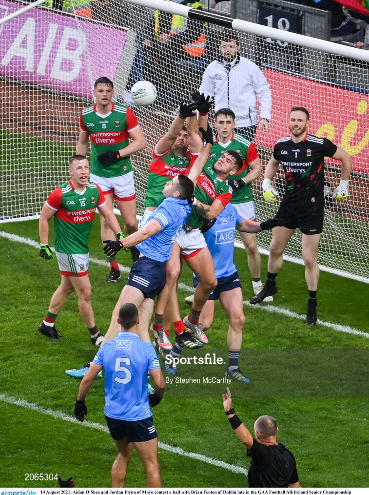 14 August 2021; Aidan O'Shea and Jordan Flynn of Mayo contest a ball with Brian Fenton of Dublin late in the GAA Football All-Ireland Senior Championship semi-final match between Dublin and Mayo at Croke Park in Dublin. Photo by Stephen McCarthy/Sportsfile
