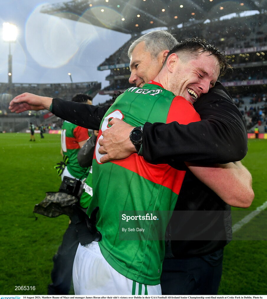 14 August 2021; Matthew Ruane of Mayo and manager James Horan after their side's victory over Dublin in their GAA Football All-Ireland Senior Championship semi-final match at Croke Park in Dublin. Photo by Seb Daly/Sportsfile