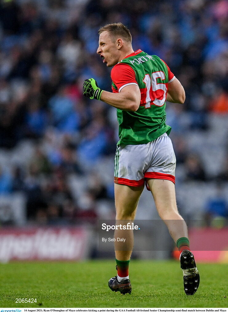14 August 2021; Ryan O'Donoghue of Mayo celebrates kicking a point during the GAA Football All-Ireland Senior Championship semi-final match between Dublin and Mayo at Croke Park in Dublin. Photo by Seb Daly/Sportsfile