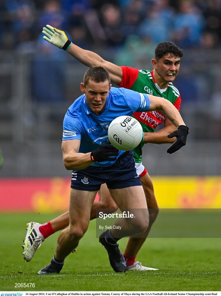 14 August 2021; Con O'Callaghan of Dublin in action against Tommy Conroy of Mayo during the GAA Football All-Ireland Senior Championship semi-final match between Dublin and Mayo at Croke Park in Dublin. Photo by Seb Daly/Sportsfile