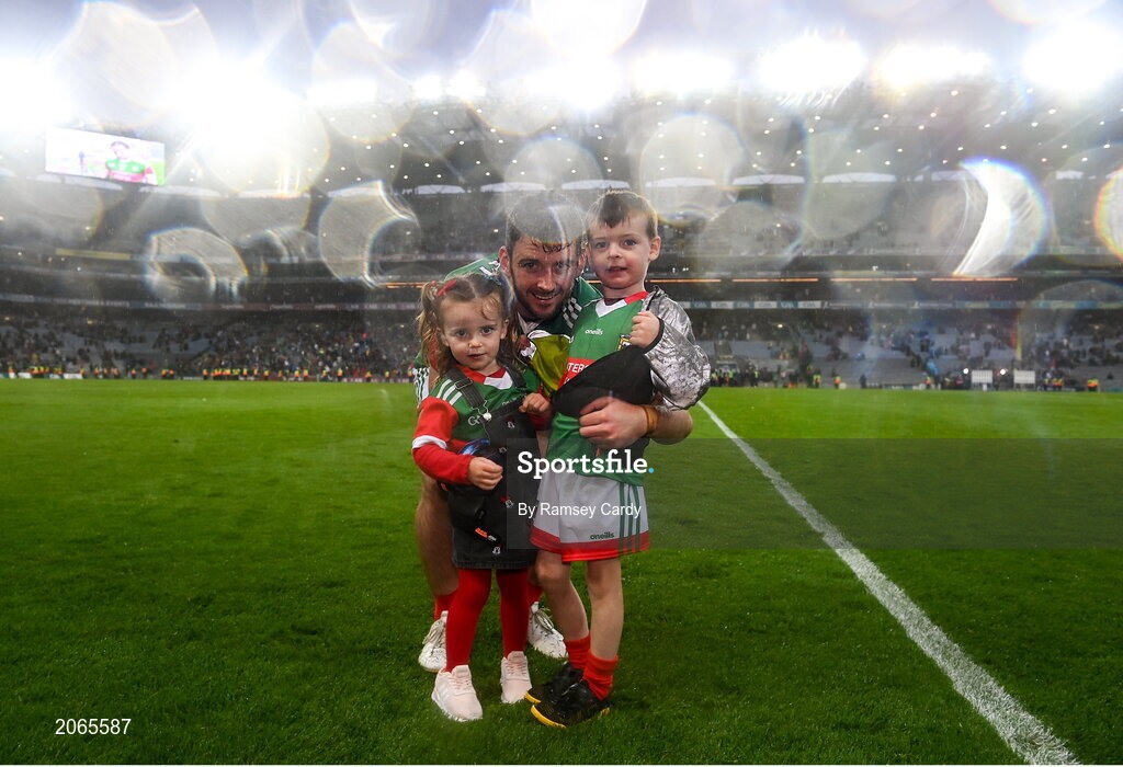 14 August 2021; Brendan Harrison of Mayo with his children Fiadh and Fionn following the GAA Football All-Ireland Senior Championship semi-final match between Dublin and Mayo at Croke Park in Dublin. Photo by Ramsey Cardy/Sportsfile