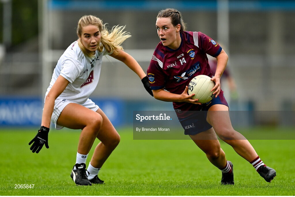 15 August 2021; Lucy McCartan of Westmeath in action against Ciara Wheeler of Kildare during the TG4 All-Ireland Senior Ladies Football Championship Semi-Final match between Kildare and Westmeath at Parnell Park in Dublin. Photo by Brendan Moran/Sportsfile
