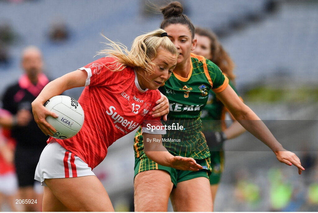 15 August 2021; Sadhbh O'Leary of Cork in action against Hannah Looney of Cork during the TG4 All-Ireland Senior Ladies Football Championship Semi-Final match between Cork and Meath at Croke Park in Dublin. Photo by Ray McManus/Sportsfile
