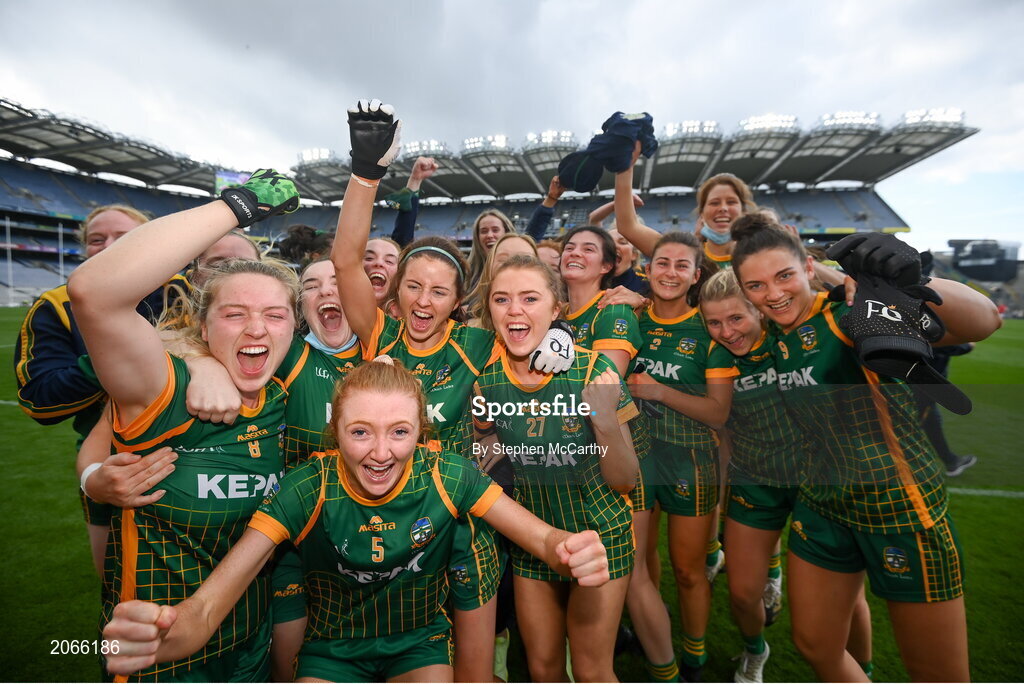 15 August 2021; Meath players celebrate following the TG4 All-Ireland Senior Ladies Football Championship Semi-Final match between Cork and Meath at Croke Park in Dublin. Photo by Stephen McCarthy/Sportsfile