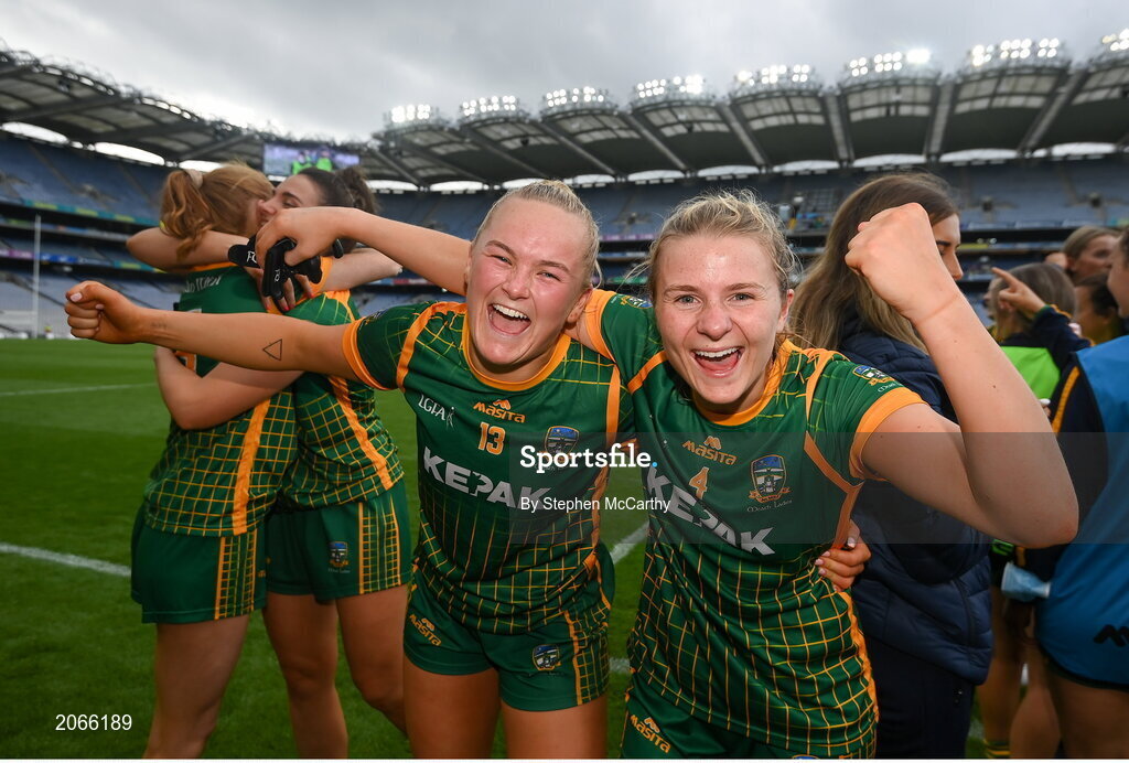 15 August 2021; Vikki Wall, left, and Katie Newe of Meath celebrate following the TG4 All-Ireland Senior Ladies Football Championship Semi-Final match between Cork and Meath at Croke Park in Dublin. Photo by Stephen McCarthy/Sportsfile