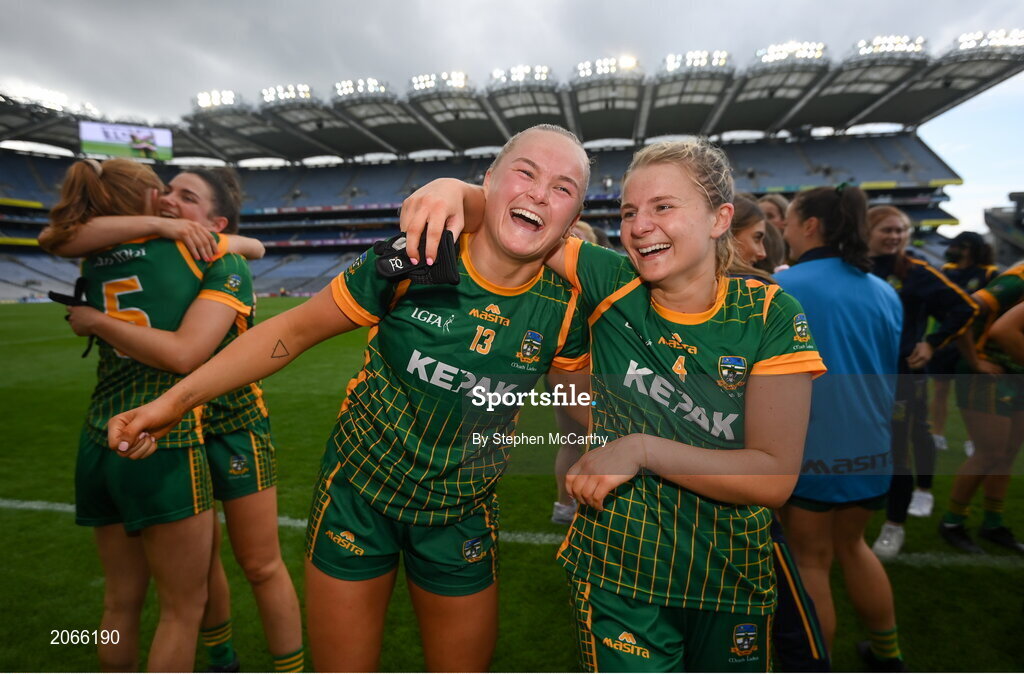 15 August 2021; Vikki Wall, left, and Katie Newe of Meath celebrate following the TG4 All-Ireland Senior Ladies Football Championship Semi-Final match between Cork and Meath at Croke Park in Dublin. Photo by Stephen McCarthy/Sportsfile