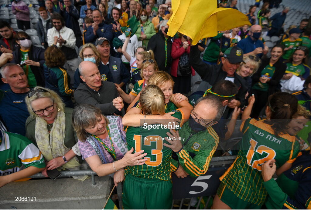 15 August 2021; Vikki Wall of Meath is congratulated by family and friends following the TG4 All-Ireland Senior Ladies Football Championship Semi-Final match between Cork and Meath at Croke Park in Dublin. Photo by Stephen McCarthy/Sportsfile