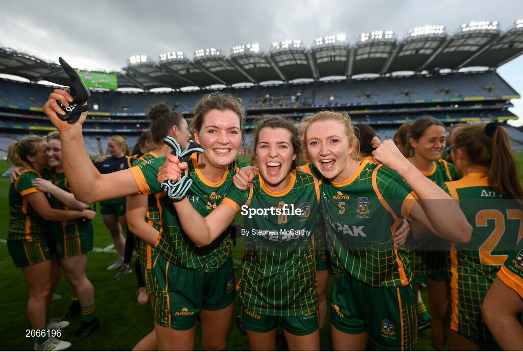 15 August 2021; Meath players, from left, Kate Byrne, Orla Byrne and Aoibheann Leahy celebrate following the TG4 All-Ireland Senior Ladies Football Championship Semi-Final match between Cork and Meath at Croke Park in Dublin. Photo by Stephen McCarthy/Sportsfile