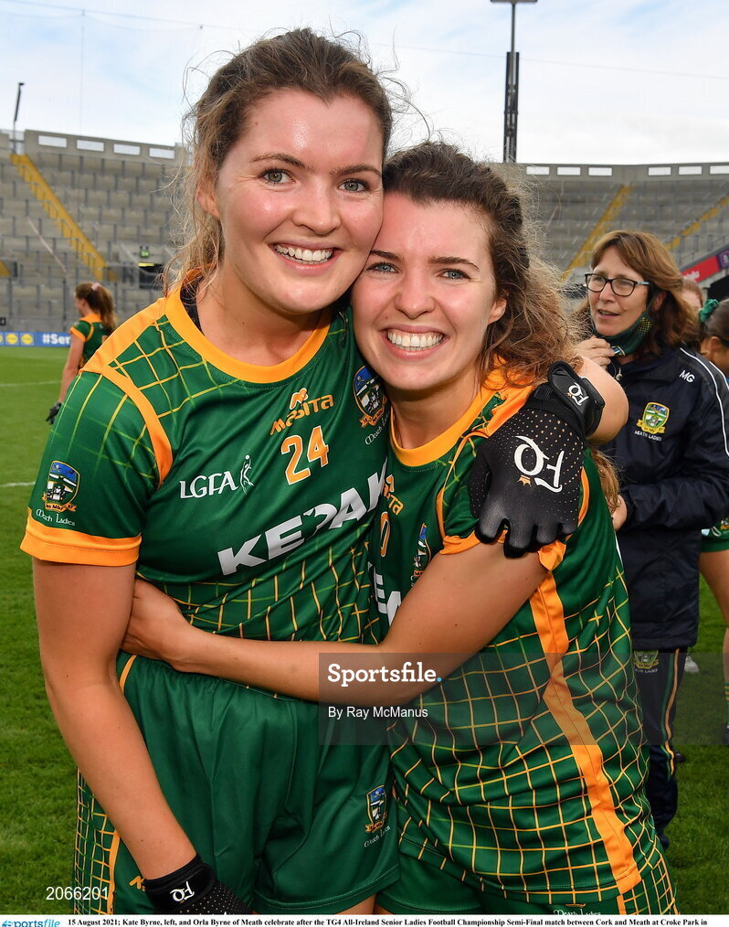 15 August 2021; Kate Byrne, left, and Orla Byrne of Meath celebrate after the TG4 All-Ireland Senior Ladies Football Championship Semi-Final match between Cork and Meath at Croke Park in Dublin. Photo by Ray McManus/Sportsfile