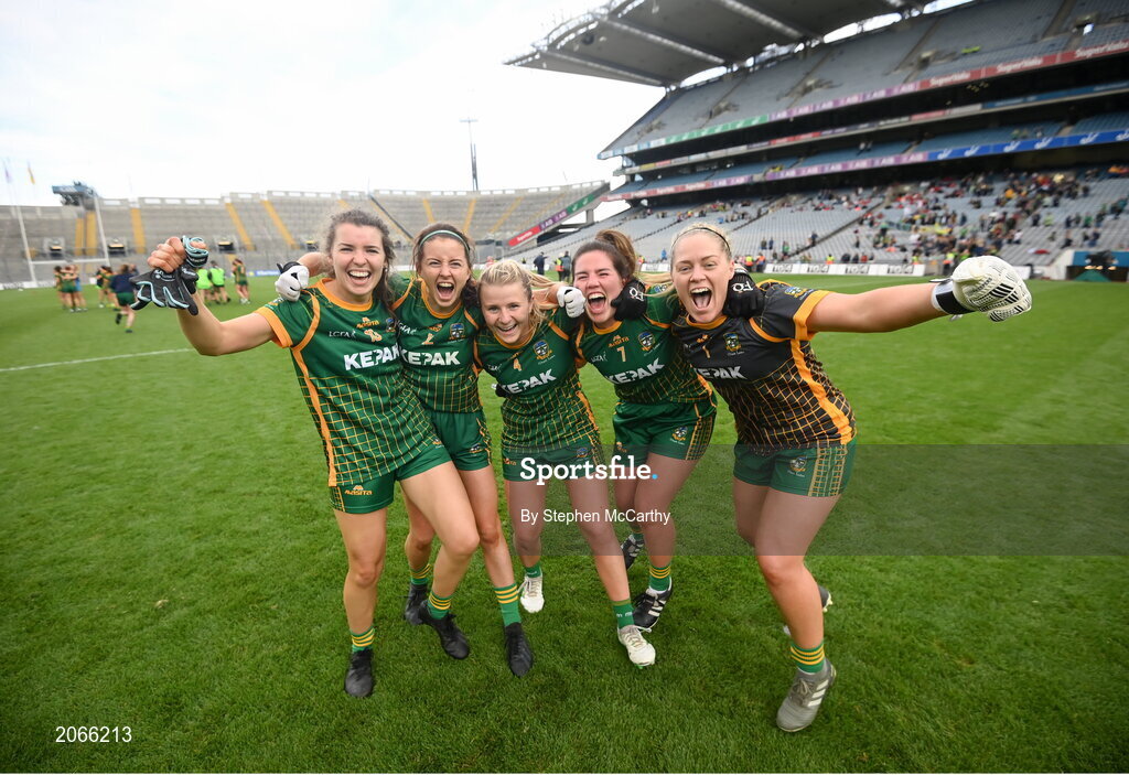 15 August 2021; Meath players, from left, Orla Byrne, Niamh O'Sullivan, Katie Newe, Shauna Ennis and Monica McGuirk celebrate following the TG4 All-Ireland Senior Ladies Football Championship Semi-Final match between Cork and Meath at Croke Park in Dublin. Photo by Stephen McCarthy/Sportsfile