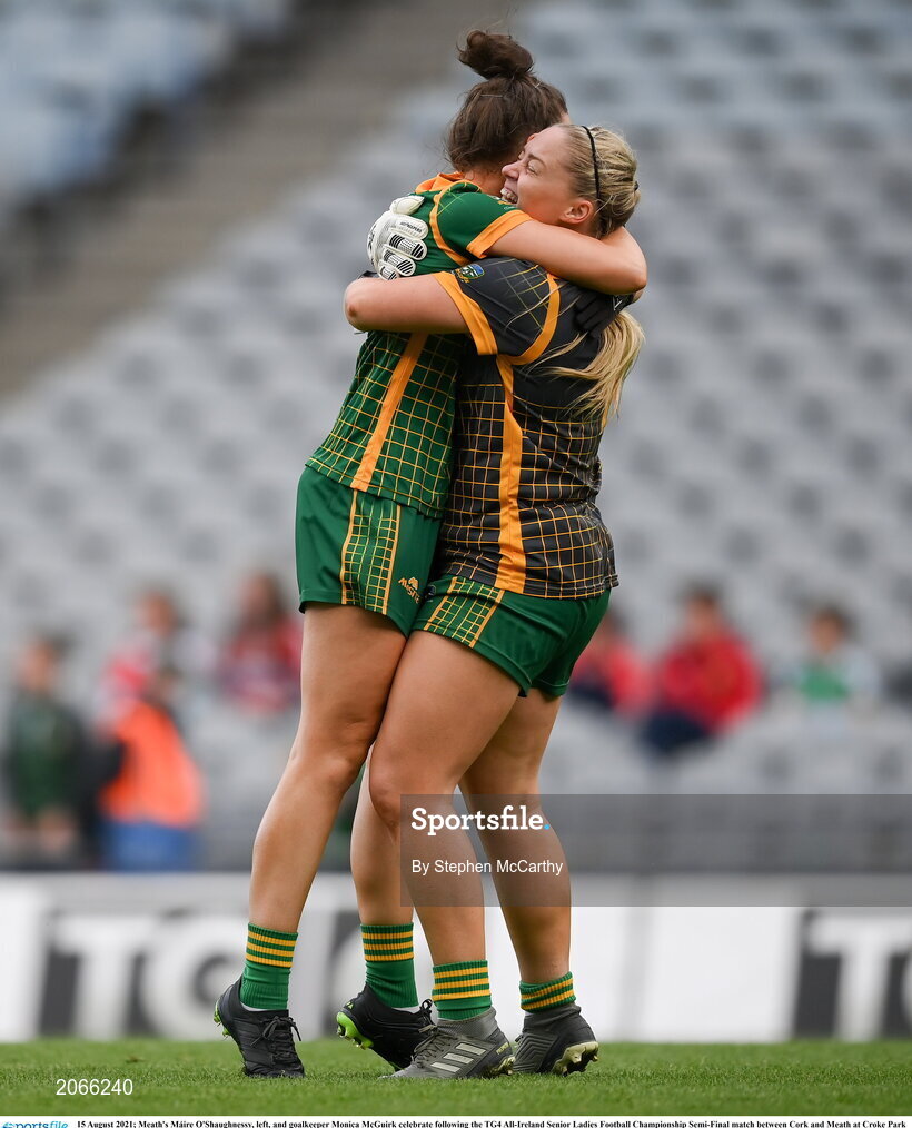 15 August 2021; Meath's Máire O'Shaughnessy, left, and goalkeeper Monica McGuirk celebrate following the TG4 All-Ireland Senior Ladies Football Championship Semi-Final match between Cork and Meath at Croke Park in Dublin. Photo by Stephen McCarthy/Sportsfile