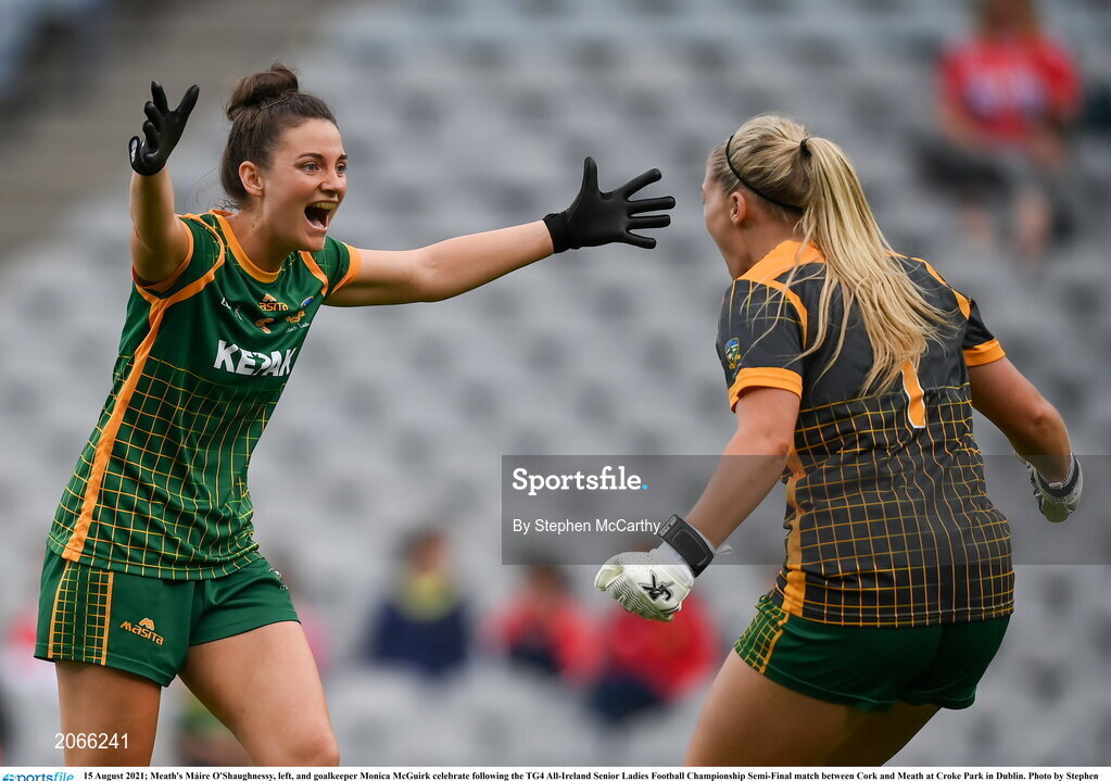 15 August 2021; Meath's Máire O'Shaughnessy, left, and goalkeeper Monica McGuirk celebrate following the TG4 All-Ireland Senior Ladies Football Championship Semi-Final match between Cork and Meath at Croke Park in Dublin. Photo by Stephen McCarthy/Sportsfile