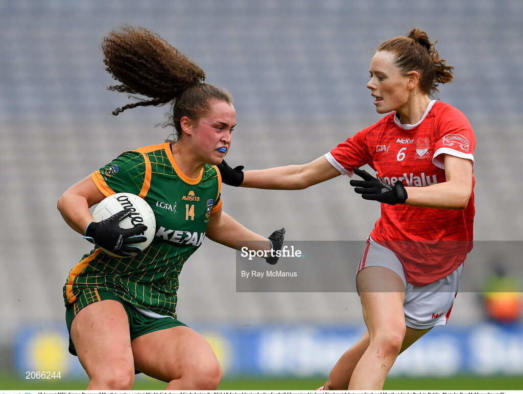 15 August 2021; Emma Duggan of Meath in action against Méabh Cahalane of Cork during the TG4 All-Ireland Senior Ladies Football Championship Semi-Final match between Cork and Meath at Croke Park in Dublin. Photo by Ray McManus/Sportsfile