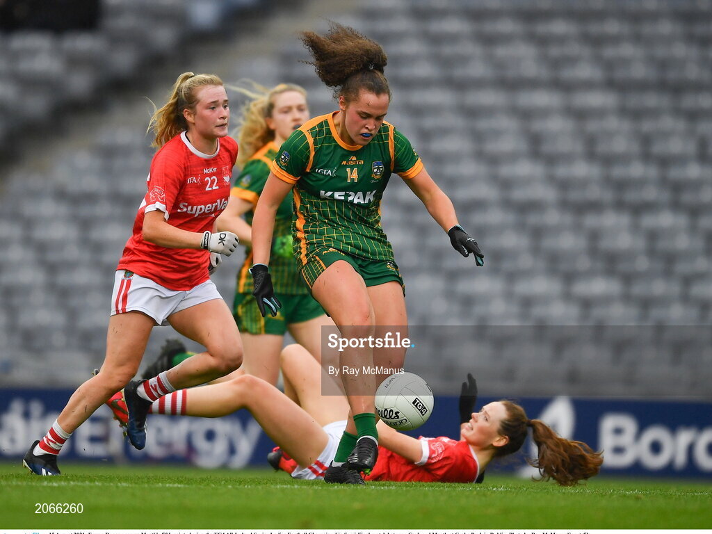 15 August 2021; Emma Duggan scores Meath's fifth point during the TG4 All-Ireland Senior Ladies Football Championship Semi-Final match between Cork and Meath at Croke Park in Dublin. Photo by Ray McManus/Sportsfile