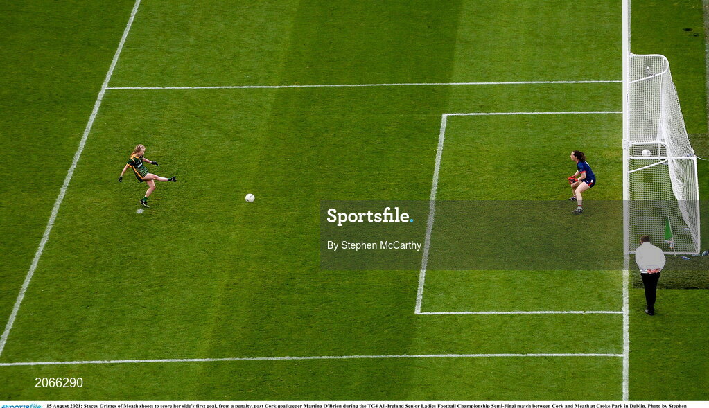 15 August 2021; Stacey Grimes of Meath shoots to score her side's first goal, from a penalty, past Cork goalkeeper Martina O'Brien during the TG4 All-Ireland Senior Ladies Football Championship Semi-Final match between Cork and Meath at Croke Park in Dublin. Photo by Stephen McCarthy/Sportsfile