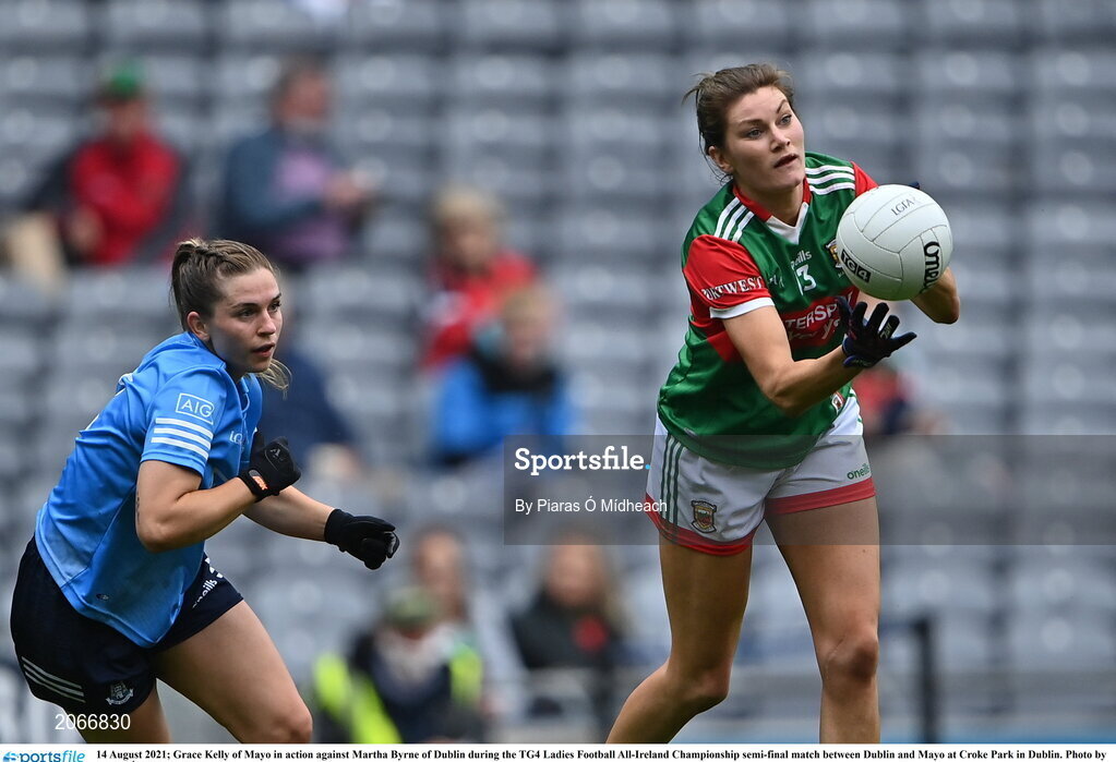 14 August 2021; Grace Kelly of Mayo in action against Martha Byrne of Dublin during the TG4 Ladies Football All-Ireland Championship semi-final match between Dublin and Mayo at Croke Park in Dublin. Photo by Piaras Ó Mídheach/Sportsfile