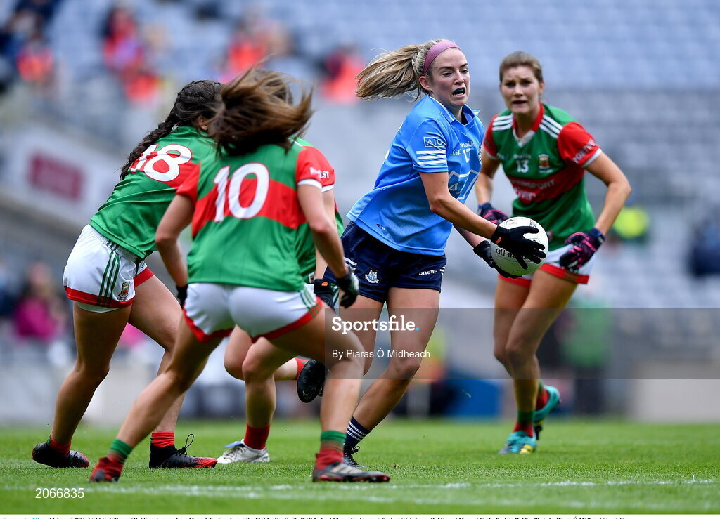 14 August 2021; Siobhán Killeen of Dublin gets away from Mayo defenders during the TG4 Ladies Football All-Ireland Championship semi-final match between Dublin and Mayo at Croke Park in Dublin. Photo by Piaras Ó Mídheach/Sportsfile