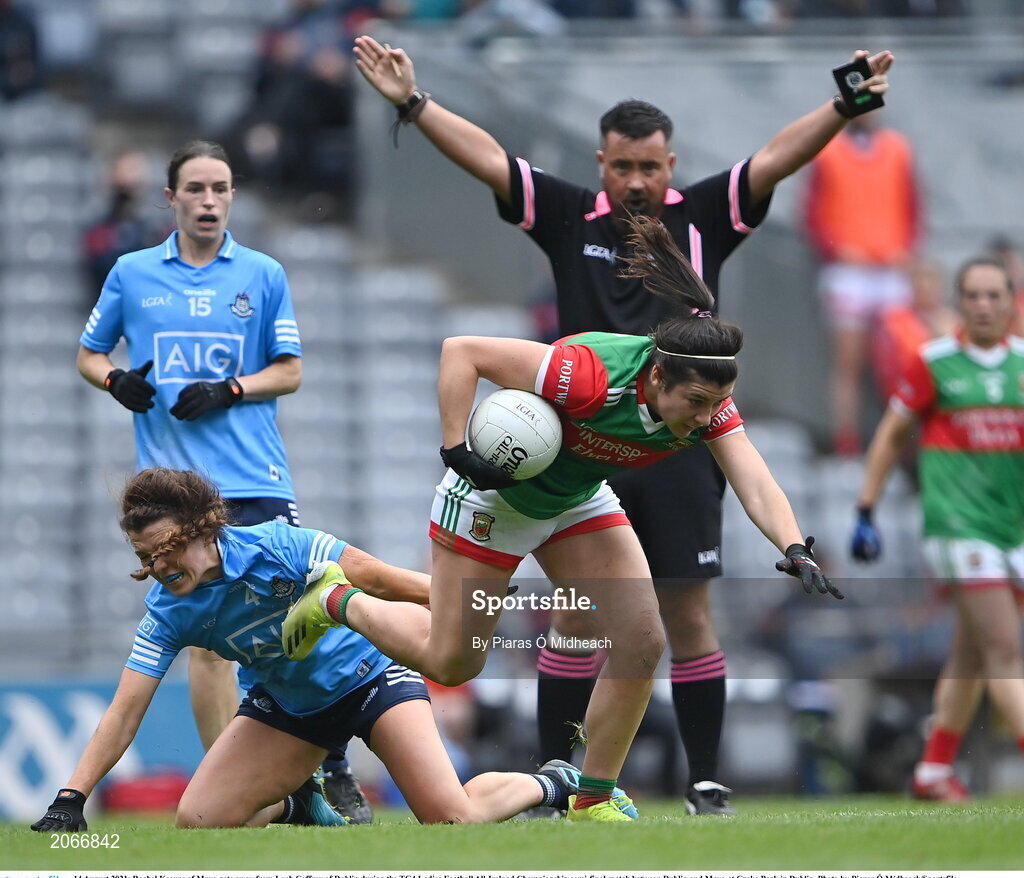 14 August 2021; Rachel Kearns of Mayo gets away from Leah Caffrey of Dublin during the TG4 Ladies Football All-Ireland Championship semi-final match between Dublin and Mayo at Croke Park in Dublin. Photo by Piaras Ó Mídheach/Sportsfile
