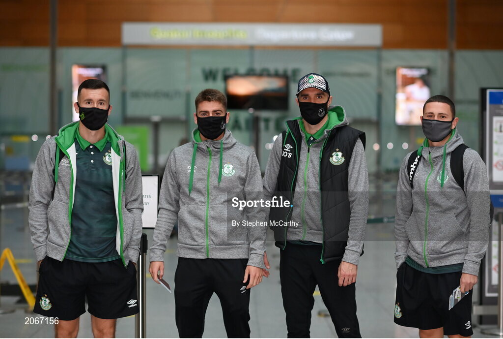 18 August 2021; Shamrock Rovers players, from left, Aaron Greene, Dylan Watts, Joey O'Brien and Max Murphy at Dublin Airport prior to their team's departure to Estonia for their UEFA Europa Conference League Play-Off First Leg match against Flora Tallinn. Photo by Stephen McCarthy/Sportsfile